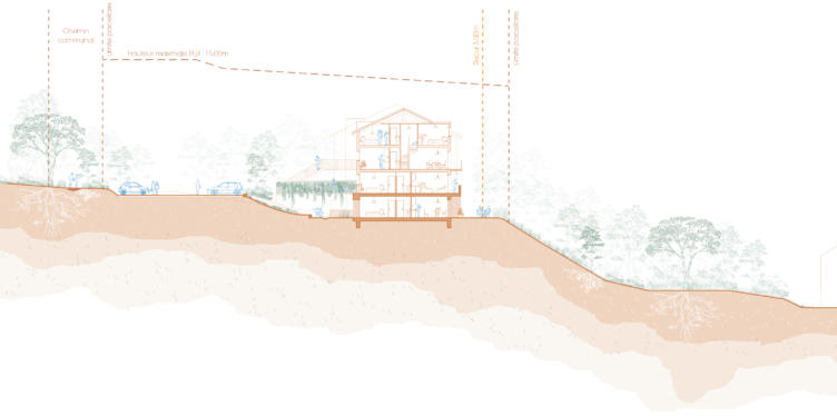 en contraste avec les bois, elle affirme l’ouverture, à la fois contrainte par les usages et nécessaire à l’apport de lumière naturelle dans les logements. Elle est qualifiante et tend à préserver les vues sur la vallée de la Seine et la confluence de l’Yonne en contrebas.